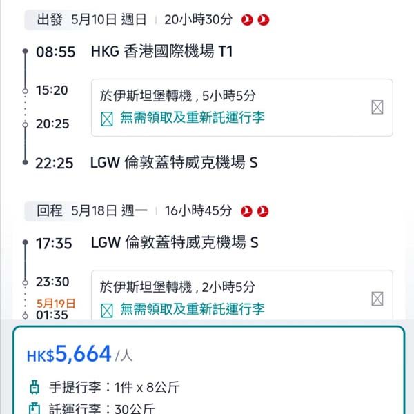 結論:今次優惠日期得五月,選擇就唔係好多,但五千六左右可以飛到倫敦,仲包30kg行李,來回轉機時間又唔長,都幾值得入手呀!想去英國探親旅遊,時間又啱,可以睇睇~