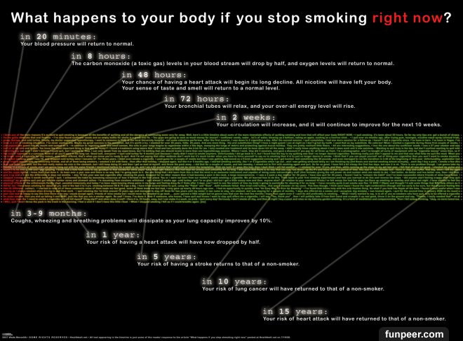 15年後:罹患冠狀動脈心臟疾病和死亡的風險降低至和沒有抽菸的人一樣。只要下定決心戒菸其實並不難,而是心理對於菸的依賴反而是許多人無法戒菸的關鍵,但是想想這些對自己的好處,以及身邊愛你的人和你愛的人的健康,還是把菸戒了吧!趕快把這些好處分享出去,讓更多人看看吧!