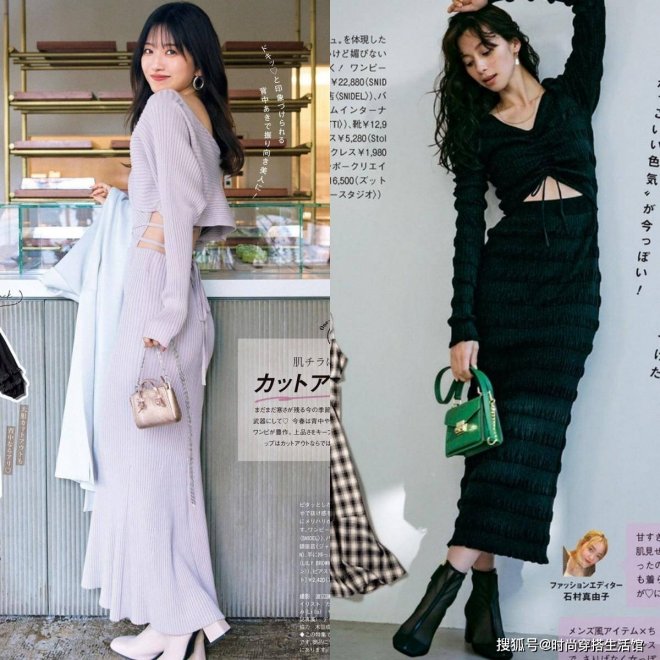 像上圖中的抽繩款式的修身打底衫、或露腰長度的毛衣,搭配高腰裙露出部分腰肢線條,既顯瘦還能優化身材比例,輕鬆穿出大長腿。