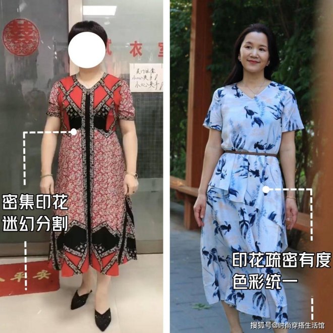 媽媽們可真的太喜歡花裙子了,各種密集印花稍有不慎很容易顯得廉價又老氣,特別是這種還帶有奇怪分割線的印花。大氣的印花通常是疏密有度,而且印花的顏色也不會太多,同色系或者2色的比較穩妥。