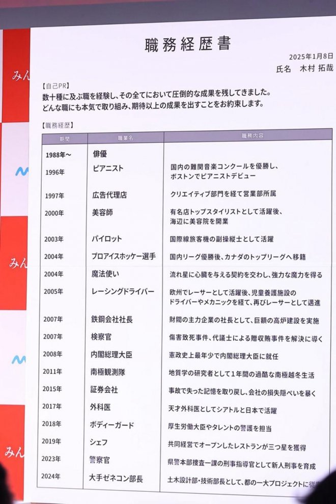 木村拓哉的這份「履歷表」其實並非真實的工作經歷,而是他為日本求職網站「マイナビ転職」拍攝的廣告。在這段廣告中,他以幽默的方式列出了自己所扮演的各式各樣的角色,從演員到鋼琴家、從飛行員到社長,甚至還有魔法使、部長、警官等,這些看似不可思議的職業,正是他在過去的演藝生涯中一一嘗試過的角色。