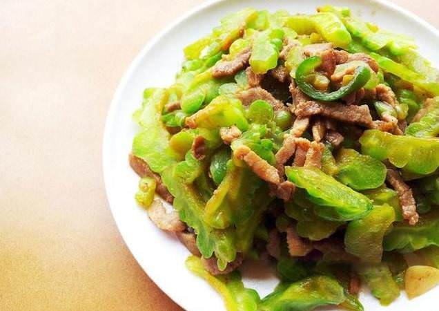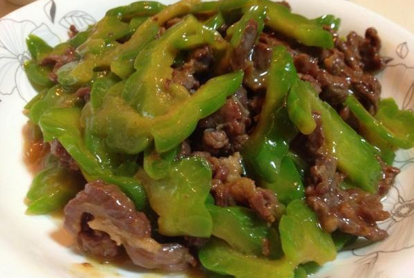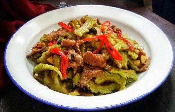 4、起油鍋燒熱,放油炒散肉絲(肉片),再倒入苦瓜、豆豉、大蒜一同炒,再加所有調味料和適量清水,翻炒入味,最後放辣椒,炒勻後即可盛盤。