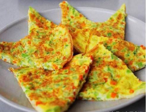 8、熱油鍋,倒入苦瓜胡蘿蔔蛋液,中小火煎