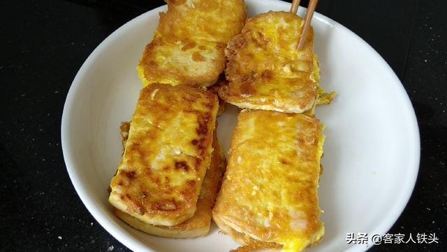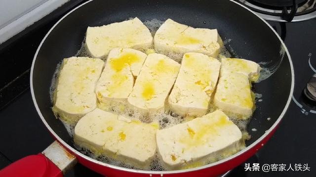 第六步:提前準備一個平底鍋,下點油,把裹好蛋液的豆腐排入,中小火來慢慢煎,火不要太大,煎好一面翻過來煎另一面,兩面煎至金黃色。