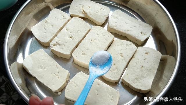 然後再反過豆腐另外一面,把另一面也灑上鹽和裹上一層生粉,弄好後腌製片刻。