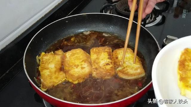 第十步:燒開後把它調成小火,加入煎好的豆腐,調成大火,把它煮至入味。