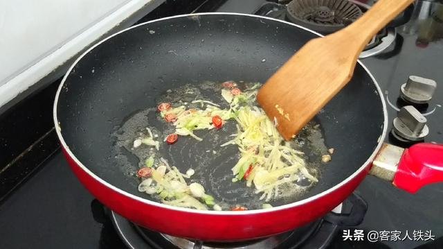 第八步:鍋中油如果比較少的話,再加一點,然後把蔥薑辣椒倒進去爆一下。
