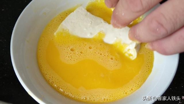 第五步:雞蛋打散後,待豆腐腌制大概半小時那樣,就可以把豆腐一塊一塊放入蛋液中,裹上一層蛋液