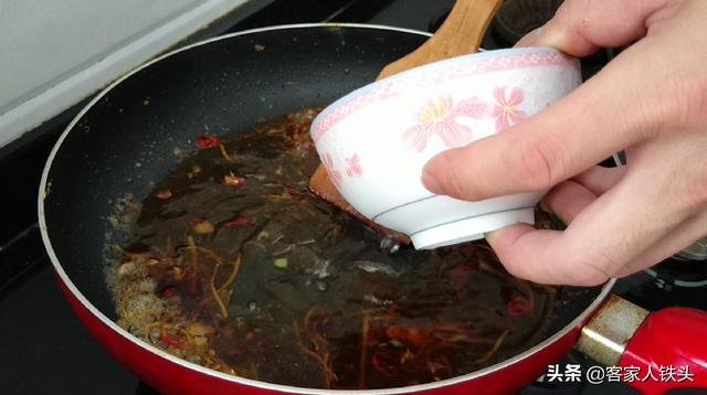 第九步:爆香後加少許糖,生抽,蚝油,適量水,把它燒開。