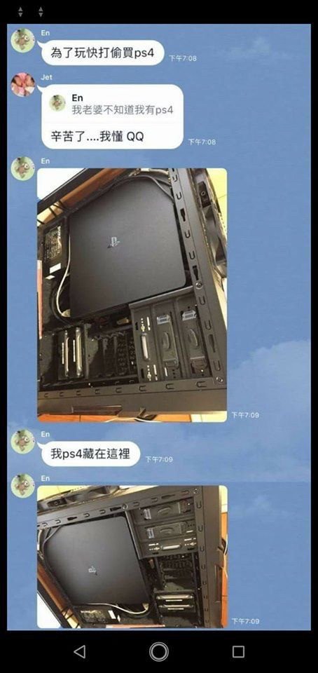 日前在PTT上就流傳著一張對話截圖照,畫面中一名網友跟朋友炫耀自己為了玩《電玩快打》而偷偷買了PS4,不過由於老婆不准,所以只能想辦法藏起來,