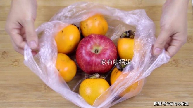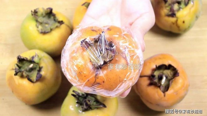 小孔紮好,為了避免外界的灰塵細菌進入小孔,對果肉造成污染,我們可以用保鮮膜將柿子一個個的包裹起來。之後再用個袋子將柿子裝好,把它放在家裡比較溫暖的地方就可以了,大概過上兩到三天的樣子,柿子就變軟,可以吃了。