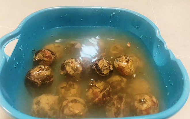 把買回來的馬蹄倒進大盆里,挑選一下,看是否有腐爛的、有蟲洞的馬蹄,如果有,那就挑出來扔掉。接著再加入大量的溫水,溫水可以促使泥巴快速的融化,接著再加入一些食用鹽,讓食用鹽給馬蹄消毒殺菌一遍,在加入一兩勺食用小蘇打和麵粉,增強清潔力,是馬蹄上的髒東西被吸附出來。然後用手去抓拌搓洗一遍,搓洗之後留著浸泡五分鐘,讓泥土能夠得到充分的分解軟化,五分鐘之後,換一盤清水來清洗,這樣馬蹄就被洗得差不多啦!