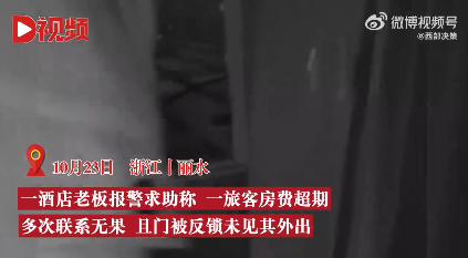 根據《ETtoday》報導,浙江麗水有一名念姓男子入住飯店,原本預計23日退房,但櫃檯怎麼等都遲遲不見人影,請房務人員敲門詢問,對方也都沒有回應,只好將情況回報給老闆,老闆就怕出了什麼事,當機立斷報警處理!