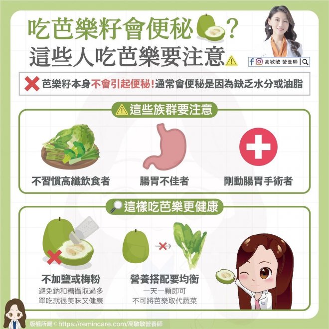 根據《ETtoday》報導,明知芭樂果肉一起吃更好,但大家仍會陷入兩難,甚至有網友在論壇發問:「芭樂籽到底吃不吃?」就怕吃了會讓自己陷入便秘深淵,幸好美女營養師高敏敏出面為大家解惑,表示芭樂籽本身並不會引起便秘,而便秘最大的主要原因是「缺乏水分」或「油脂」,只要多喝水就能幫助順暢了。