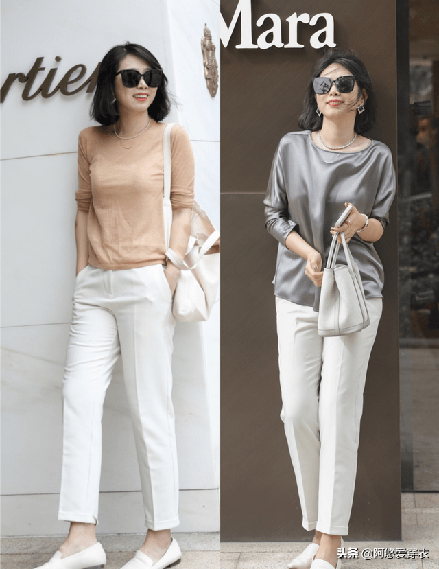 其次,推薦大家穿米色的衣服,米色是一種介於白色和黃色之間的色彩,這種色系非常的柔和,但它和白色又有一些小小的區別。根據下面對比,你也能發現左邊的純白色看上去還是有些許單調的,而右邊這種米色的單品更加柔和溫和,沒有攻擊性。