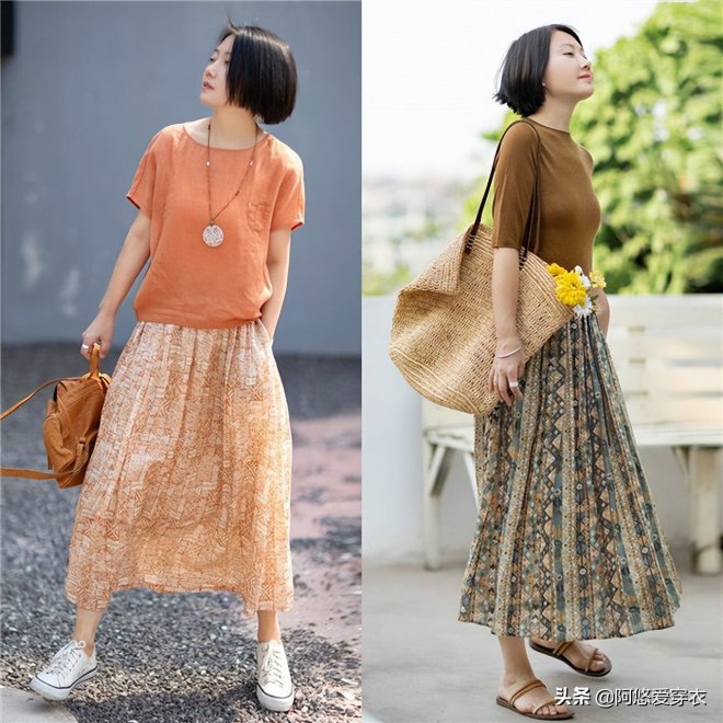 像黑色,白色這些單品往往都是比較實用和百搭的,黑色的T恤在搭配時也有著多種風格可以塑造,下半身去搭配各種彩色印花裙也並不花哨,反而能夠藉助色彩之間的呼應來營造高級感。