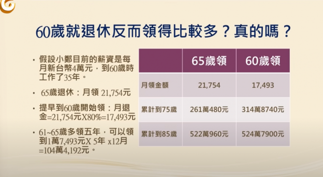 據《三立新聞》報導,財經專家郭莉芳近日受邀在節目《新聞挖挖哇》中討論勞保議題,許多人都會疑惑「本來65歲可以領,如果提早到60歲領划算嗎?」郭莉芳透露以一位每月月薪新台幣4萬的25歲勞工為例,不考慮調薪等狀況的話,一路做到60歲時,已經工作了35年,假設他在65歲開始領,一個月可以領到21754元,而如果提早五年領,雖然會打八折,一個月可以領到17493元,少了4000多元,乍看之下非常不划算...