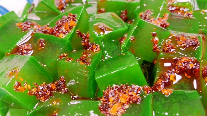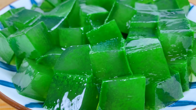 艾草汁放置涼透后,用手輕輕按壓表面,待艾草汁完全凝固后,把盆倒扣在菜板上,將製作好的艾草涼粉扣出,用刀切成大小適中的小塊,然後盛入盤中。