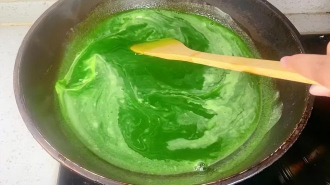 取適量白涼粉放入碗中,加水攪拌均勻,然後把炒鍋徹底刷乾淨,不能有一點點油,否則影響涼粉後面的製作,將艾草汁倒入炒鍋中大火燒開,用鏟子輕輕攪拌,艾草汁燒開后煮制三分鐘,把調好的白涼粉向鍋中慢慢倒入,倒的過程中要用鏟子不斷攪拌,白涼粉倒完後轉成中火慢慢熬煮,直到把艾草汁熬成粘稠狀關火。