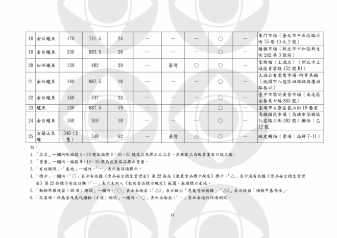 目前仍待衛福部確認是否違反食品安全衛生管理法相關規定,若確認違法,可處新台幣6萬元以上、2萬元以下罰鍰,另外,抽查出有22件樣品為散裝,僅3件為包裝產品,其中1件沒有標示有效日期,也待衛生福利部確認後執法,消基會呼籲民眾買魚時要避開眼睛混濁、有腐臭或刺激性味道產品,若是按壓魚腹無黏液物體從排泄口跑出,就代表魚貨新鮮可安心購買!