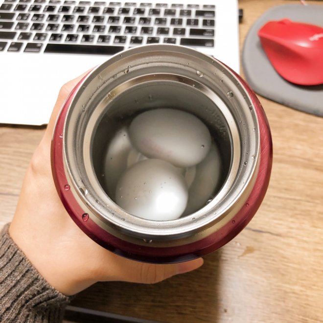 步驟簡單又方便,讓她心動不已,決定實際測試一下,先將雞蛋清洗乾淨後放入保溫瓶或燜燒罐,將剛煮好的熱水倒入加滿,蓋子蓋緊靜置20分鐘即可,切開水煮蛋是超完美熟度,驚喜喊話:「直接省去買早餐的時間!」興奮推薦這招給愛吃水煮蛋、公司又沒電鍋的人!