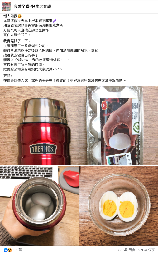 根據《風傳媒》報導,不少網友會在臉書社團「我愛全聯-好物老實説」分享好物或妙招,曾有網友透露早上想吃水煮蛋,但常常爬不起來,結果朋友分享一妙招,只要用保溫瓶就能做水煮蛋,不用插電也不用顧火,到辦公室就能操作。