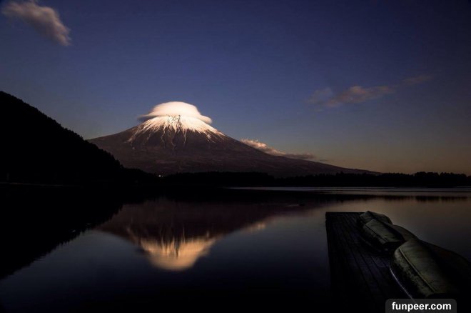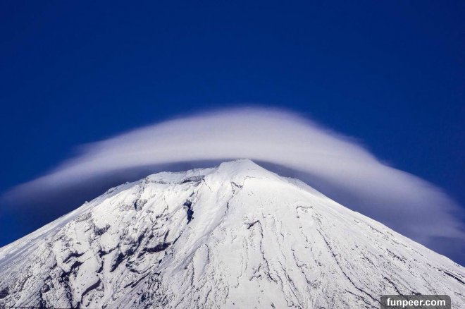 日本富士山,係晴朗的一天出發,神奇雲層係富士山山頂形成左一個奇怪既環繞雲團,好似富士山頭戴左一頂帽子。