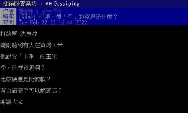 根據《聯合報》報導,有網友在論壇「PTT」上發文,忍不住好奇詢問「台語很季的意思是什麼?」原來他剛剛在買烤玉米時,