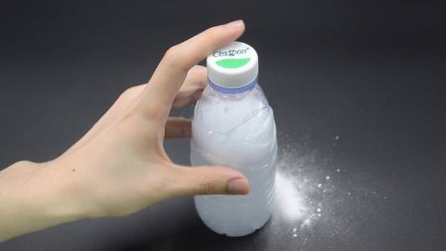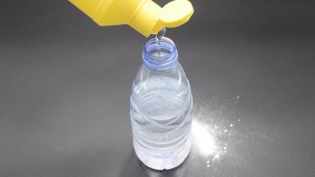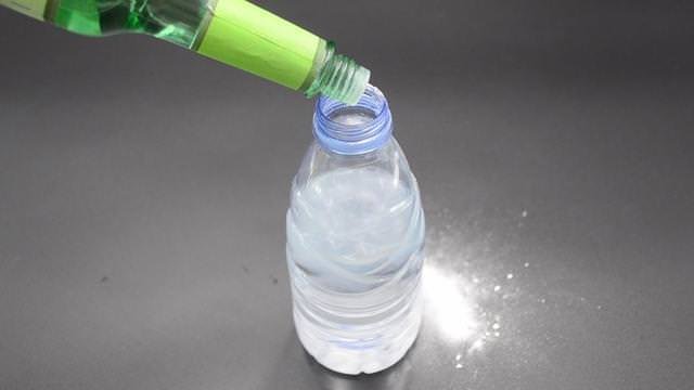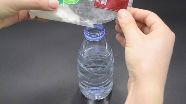 首先準備半個塑膠瓶的清水,並且往水裡倒入一勺的小蘇打。