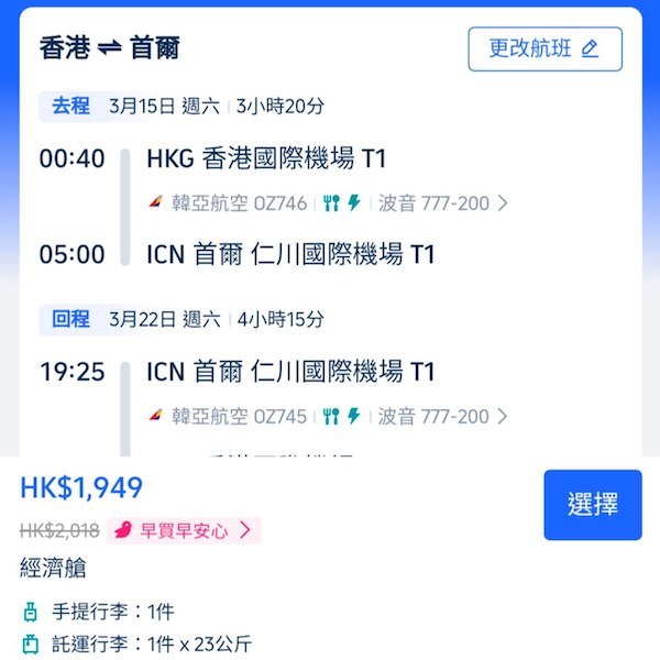 來回連稅價錢:HK$1,949起(3月尾會貴HK$10左右)