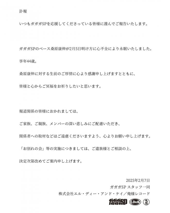 GaGaGa SP官方於2月7日正式對外公告:「我們謹向一直支持GaGaGa SP的大家報告,*貝斯手桑原康伸於2月5日凌晨因心臟衰竭辭世,享年44歲。*我們衷心感謝大家生前對桑原康伸的厚愛,並與大家一同誠摯祈禱他的靈魂安息。」官方也補充表示,目前告別式的安排仍在與家屬協商,細節將另行通知。