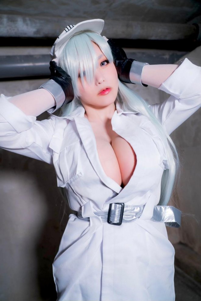 從俐落的白帽到服裝細節都處理得一絲不苟,再配上她本來就超有氣場的眼神,以及那個完全撐起畫面的K罩杯……只能說這根本是角色本人降臨。😳