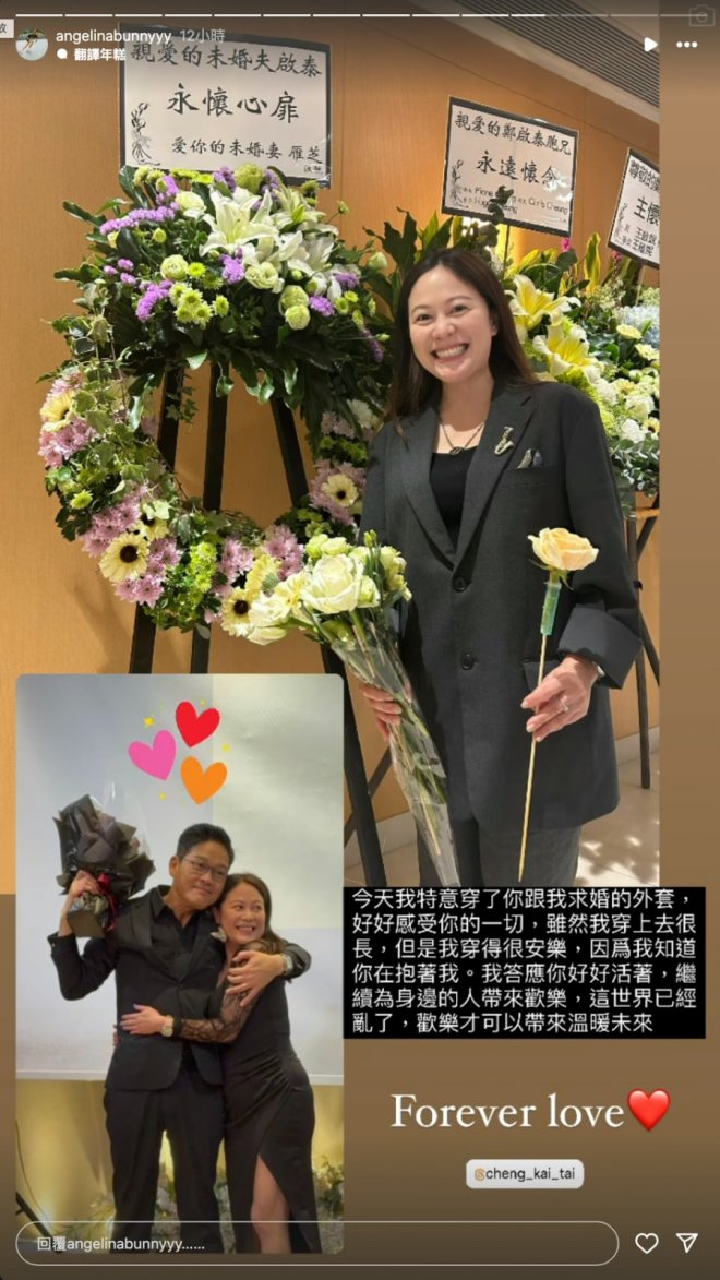 到了追思會這天,王雁芝再次吐露心境,分享追思會的花圈照,上面寫著:「親愛的未婚夫啟泰,永懷心扉,愛你的未婚妻雁芝。」努力揚起笑容送別鄭啟泰,不讓逝者掛念,她更特地穿上求婚那天,鄭啟泰身上的西裝外套,彷彿他就在身邊抱著她,讓她有勇氣面對這一切,堅強表示:「我答應你好好活著,繼續為身邊的人帶來歡樂。」畫面讓人看了相當鼻酸!