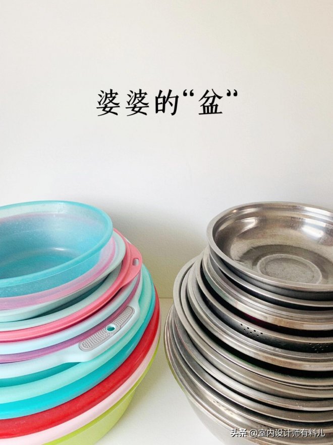 我家堆積的大大小小的盆子都是婆婆攢下的「家業」,數不清的盆子和瀝水籃,實際上常用的就那幾個,剩下的還得找地方收納,尤其是臉盆,浴室有,陽台也有,放哪都覺得礙眼。