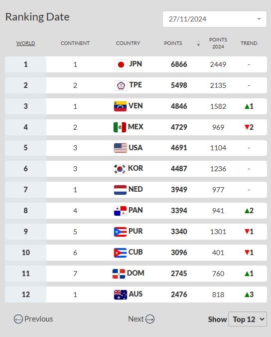 世界棒壘球總會(WBSC)公布最新棒球世界排名,中華隊憑藉在今年12強賽奪得冠軍的表現,積分進帳逾千分,不僅超越墨西哥,穩居世界第二,還將與榜首日本的差距縮小到1368分。棒球球評陳亞理指出,台灣之所以能持續在排名前段班,得益於少年少棒、青少棒及青棒的長期穩定表現。然而,他也認為,由於日本目前積分高達6866分,短時間內台灣要超越仍有相當難度。