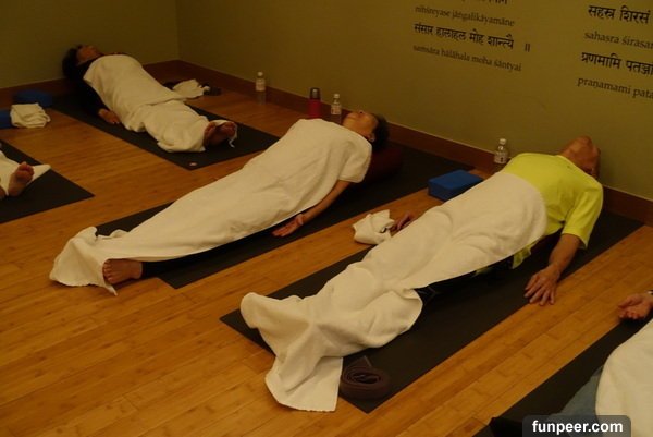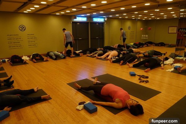 課堂結束前老師刻意把燈打暗,在進入大休息這個動作時,讓大家蓋上大毛巾,讓肩膀、胸腔和腹部可以打開且放鬆,配合呼吸就能讓身心達到完全的放鬆。